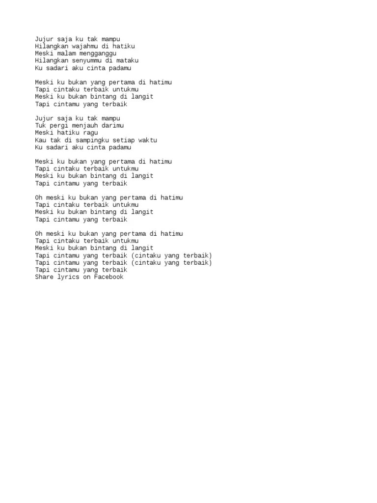 Tapi cintaku terbaik untukmu · jujur saja . Meski 'ku bukan yang pertama di hatimu. Meski 'ku bukan bintang di langit. Simak lirik lagu dan chord cinta terbaik yang dibawakan oleh grup band cassandra dengan penggalan lirik, meski ku bukan yang pertama, . Meski ku bukan bintang dilangit.